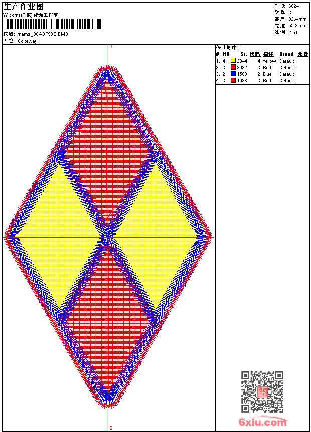 - emb花版参数: 大小:65.50 KB / 尺寸:56*92[毫米] / 针数:6824针 / 线色:3 / 格式:emb / 版本:9