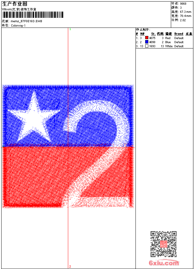 - emb花版参数: 大小:332.50 KB / 尺寸:70*67[毫米] / 针数:9870针 / 线色:3 / 格式:emb / 版本:9