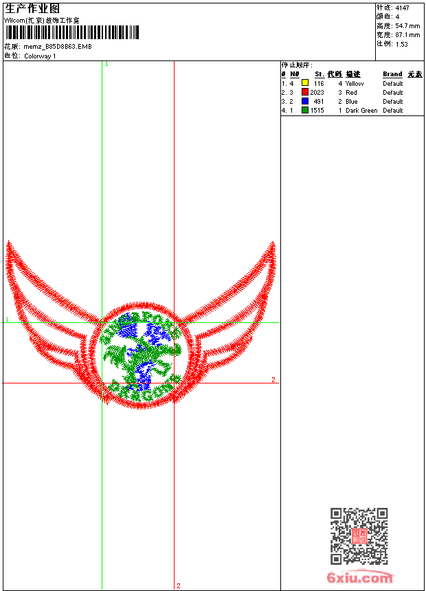 - emb花版参数: 大小:60.00 KB / 尺寸:87*55[毫米] / 针数:4147针 / 线色:4 / 格式:emb / 版本:9
