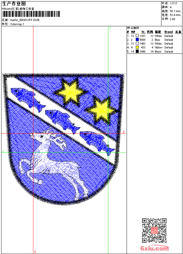- emb花版参数: 大小:61.50 KB / 尺寸:54*58[毫米] / 针数:11717针 / 线色:4 / 格式:emb / 版本:9