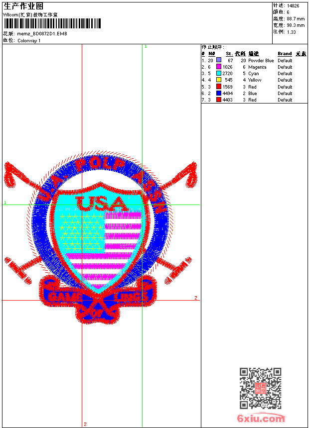 - emb花版参数: 大小:94.00 KB / 尺寸:98*89[毫米] / 针数:14826针 / 线色:6 / 格式:emb / 版本:9