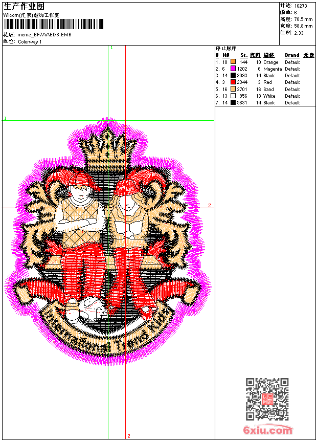 - emb花版参数: 大小:157.50 KB / 尺寸:59*71[毫米] / 针数:16273针 / 线色:6 / 格式:emb / 版本:9