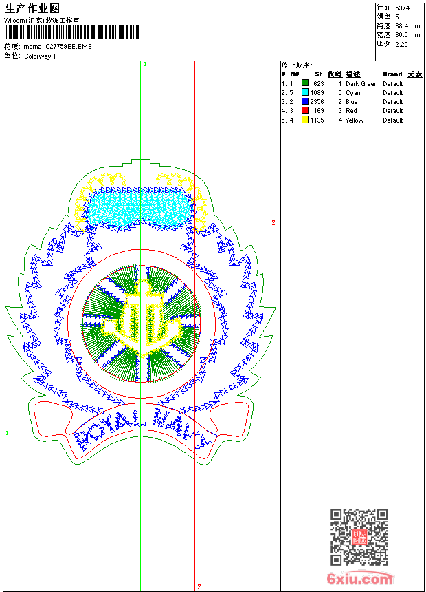 - emb花版参数: 大小:115.50 KB / 尺寸:61*68[毫米] / 针数:5374针 / 线色:5 / 格式:emb / 版本:9