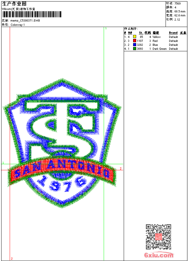 - emb花版参数: 大小:56.50 KB / 尺寸:63*68[毫米] / 针数:7569针 / 线色:4 / 格式:emb / 版本:9