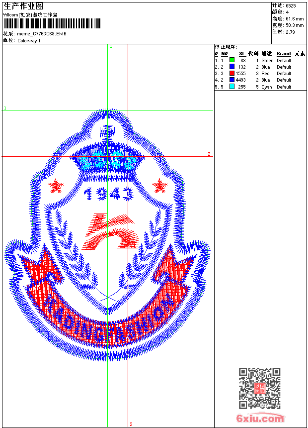 - emb花版参数: 大小:69.00 KB / 尺寸:50*62[毫米] / 针数:6525针 / 线色:4 / 格式:emb / 版本:9