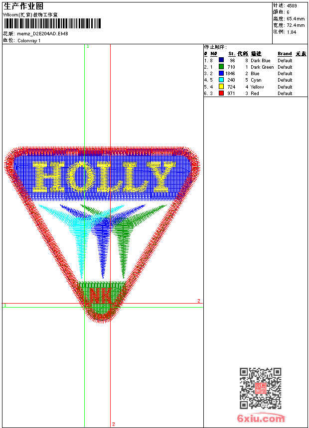 - emb花版参数: 大小:32.50 KB / 尺寸:72*65[毫米] / 针数:4589针 / 线色:6 / 格式:emb / 版本:9
