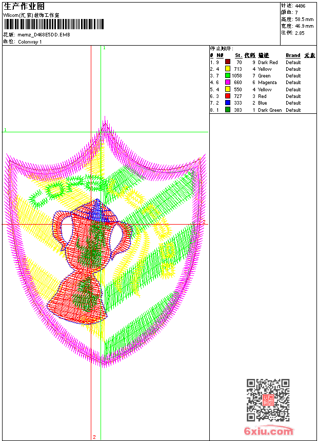 - emb花版参数: 大小:50.00 KB / 尺寸:47*58[毫米] / 针数:4496针 / 线色:7 / 格式:emb / 版本:9