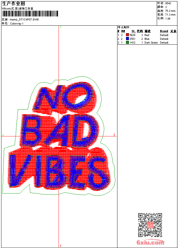 - emb花版参数: 大小:71.50 KB / 尺寸:71*75[毫米] / 针数:9543针 / 线色:3 / 格式:emb / 版本:9