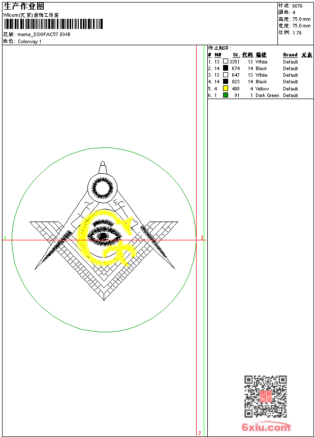 - emb花版参数: 大小:1.82 MB / 尺寸:75*75[毫米] / 针数:6076针 / 线色:4 / 格式:emb / 版本:9