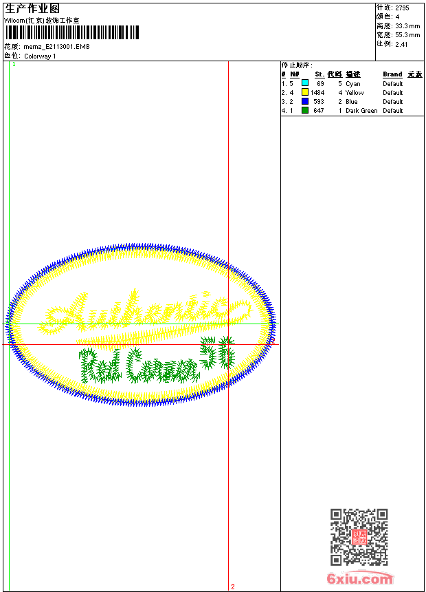 - emb花版参数: 大小:44.00 KB / 尺寸:55*33[毫米] / 针数:2795针 / 线色:4 / 格式:emb / 版本:9
