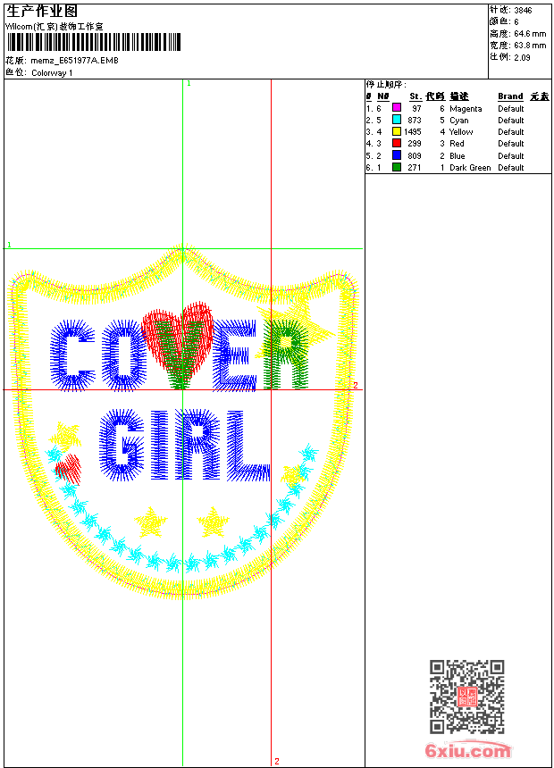 - emb花版参数: 大小:135.50 KB / 尺寸:64*65[毫米] / 针数:3846针 / 线色:6 / 格式:emb / 版本:9