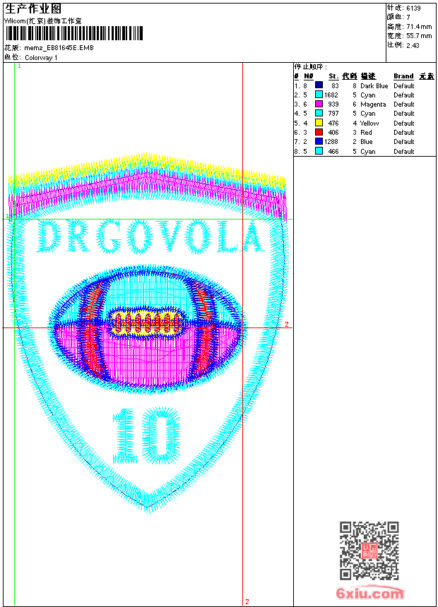 - emb花版参数: 大小:55.00 KB / 尺寸:56*71[毫米] / 针数:6139针 / 线色:7 / 格式:emb / 版本:9