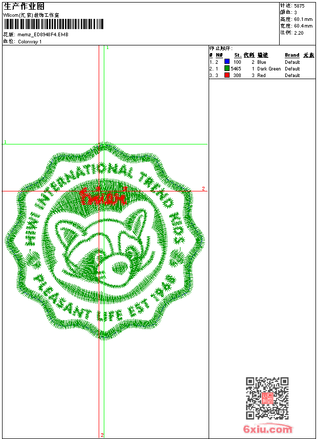 - emb花版参数: 大小:73.50 KB / 尺寸:60*60[毫米] / 针数:5875针 / 线色:3 / 格式:emb / 版本:9