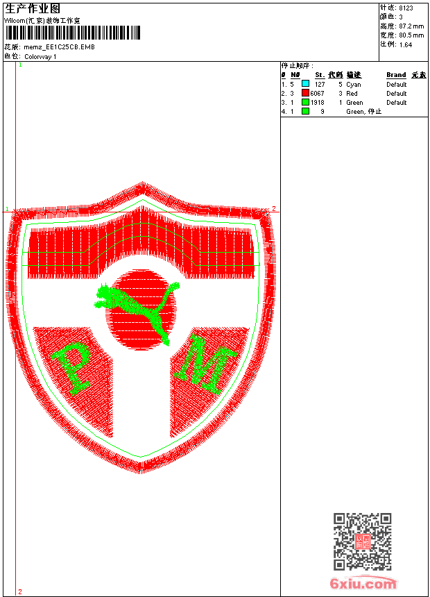 - emb花版参数: 大小:43.50 KB / 尺寸:81*87[毫米] / 针数:8123针 / 线色:3 / 格式:emb / 版本:9