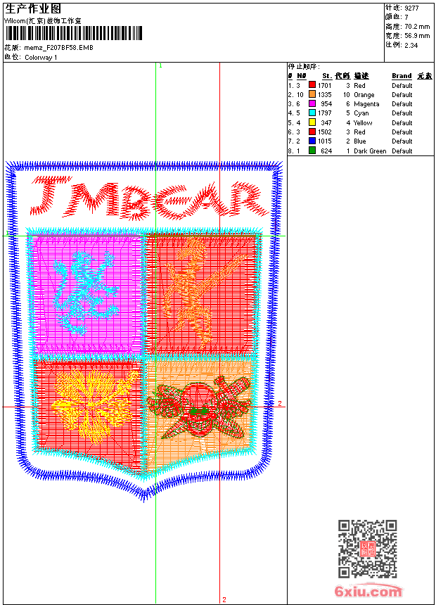 - emb花版参数: 大小:73.00 KB / 尺寸:57*70[毫米] / 针数:9277针 / 线色:7 / 格式:emb / 版本:9