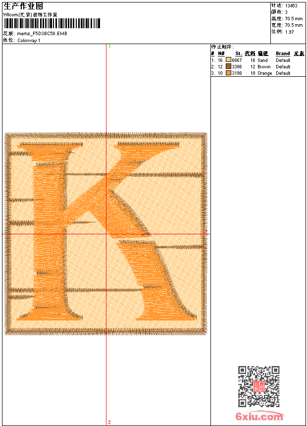 - emb花版参数: 大小:402.00 KB / 尺寸:71*70[毫米] / 针数:13455针 / 线色:3 / 格式:emb / 版本:9