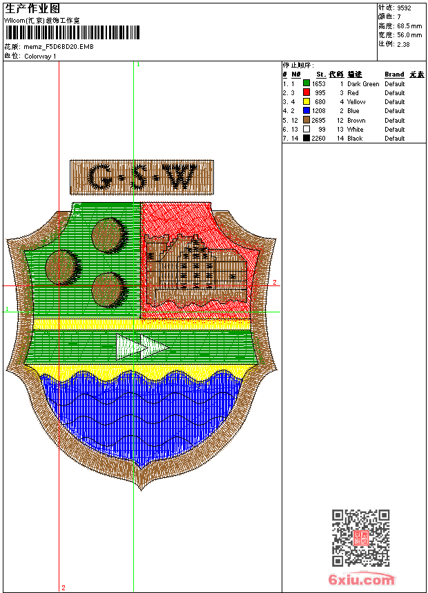 - emb花版参数: 大小:52.50 KB / 尺寸:56*68[毫米] / 针数:9592针 / 线色:7 / 格式:emb / 版本:9