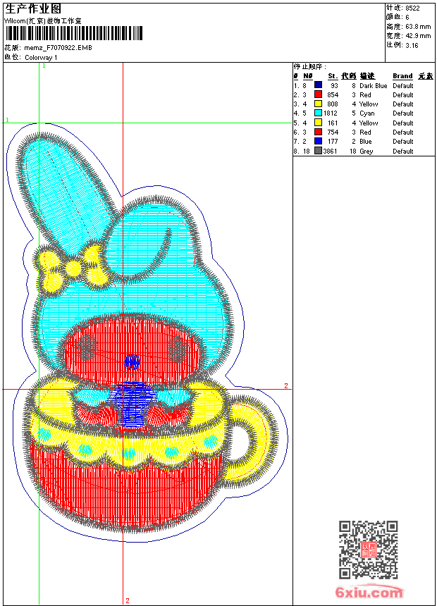 - emb花版参数: 大小:70.50 KB / 尺寸:43*64[毫米] / 针数:8522针 / 线色:6 / 格式:emb / 版本:9