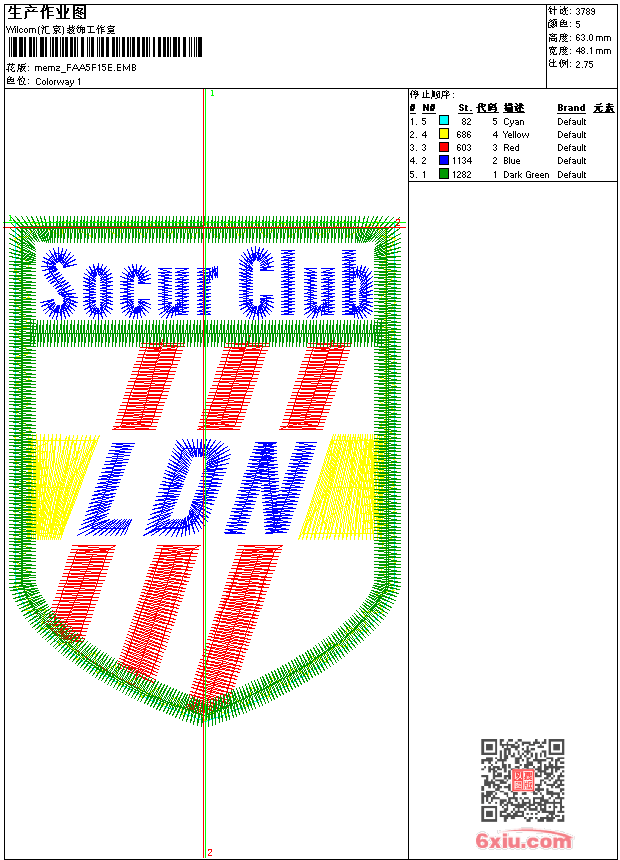 - emb花版参数: 大小:32.00 KB / 尺寸:48*63[毫米] / 针数:3789针 / 线色:5 / 格式:emb / 版本:9
