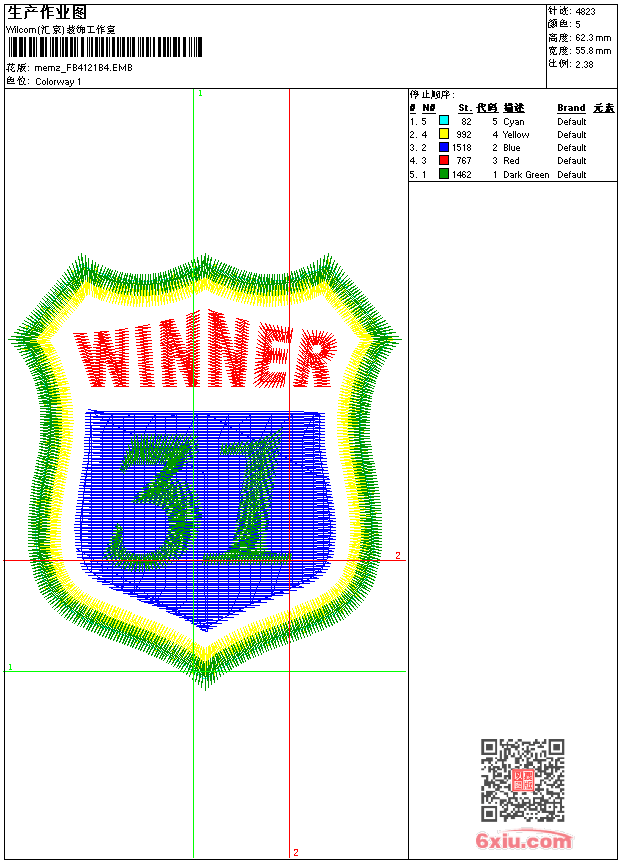 - emb花版参数: 大小:39.00 KB / 尺寸:56*62[毫米] / 针数:4823针 / 线色:5 / 格式:emb / 版本:9