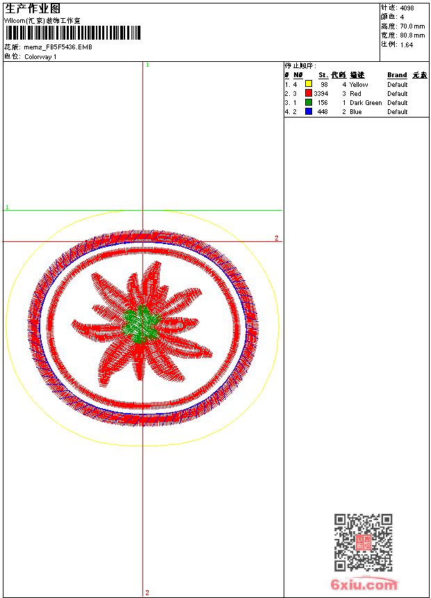 - emb花版参数: 大小:40.00 KB / 尺寸:81*70[毫米] / 针数:4098针 / 线色:4 / 格式:emb / 版本:9