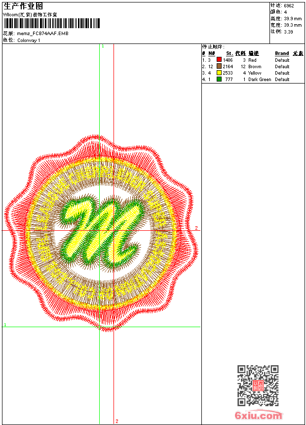- emb花版参数: 大小:63.00 KB / 尺寸:39*40[毫米] / 针数:6962针 / 线色:4 / 格式:emb / 版本:9