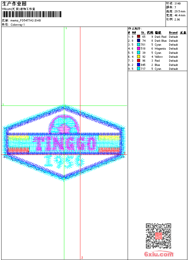 - emb花版参数: 大小:33.50 KB / 尺寸:46*30[毫米] / 针数:3149针 / 线色:7 / 格式:emb / 版本:9