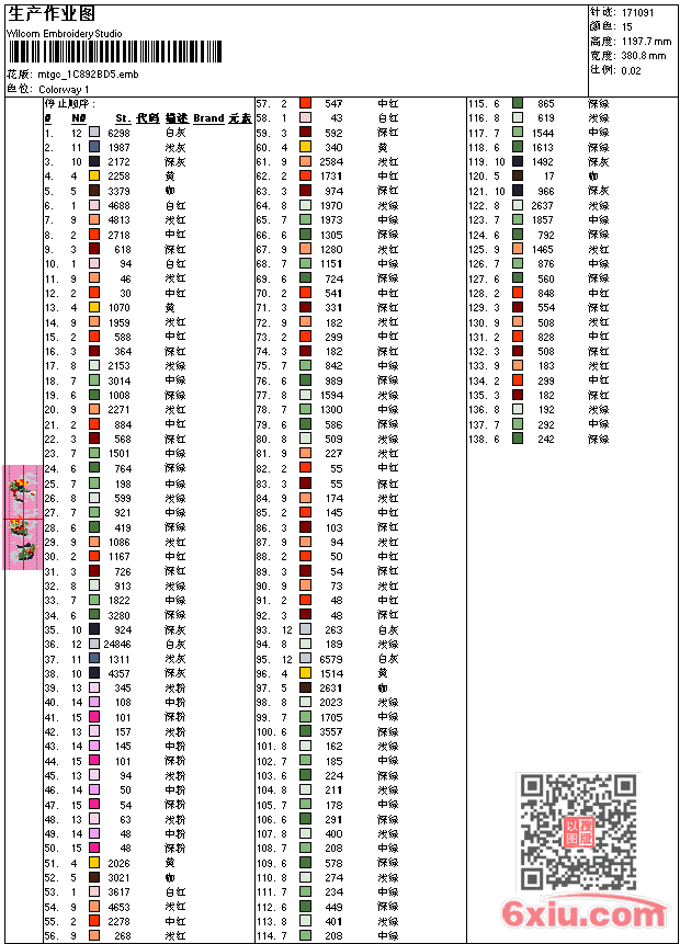 - emb花版参数: 大小:1.01 MB / 尺寸:381*1198[毫米] / 针数:171091针 / 线色:15 / 格式:emb / 版本:e2