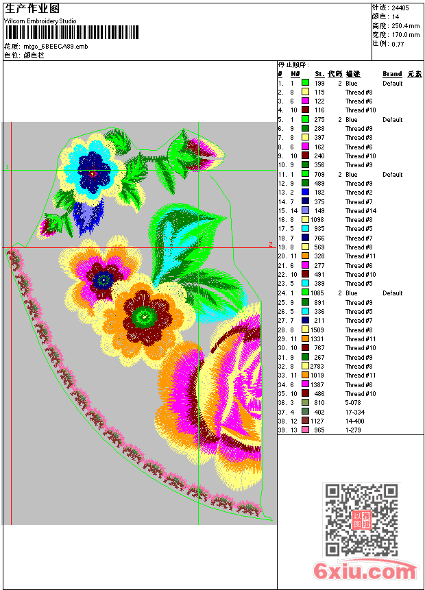 - emb花版参数: 大小:261.50 KB / 尺寸:170*250[毫米] / 针数:24405针 / 线色:14 / 格式:emb / 版本:e2