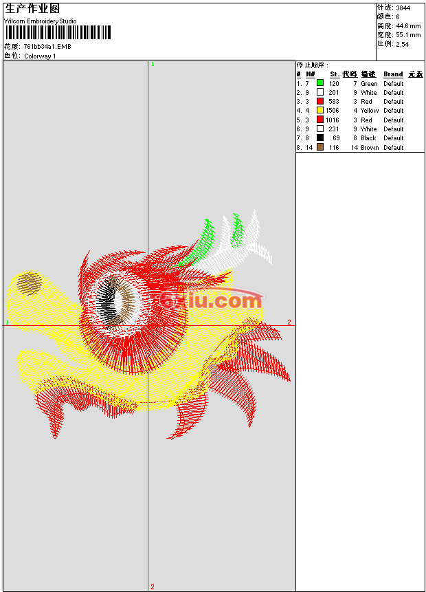 - emb花版参数: 大小:131.00 KB / 尺寸:55*45[毫米] / 针数:3844针 / 线色:6 / 格式:emb / 版本:e4.2