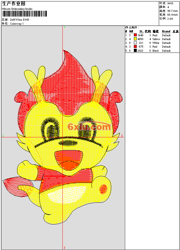 - emb花版参数: 大小:195.50 KB / 尺寸:68*100[毫米] / 针数:9410针 / 线色:4 / 格式:emb / 版本:e4.2