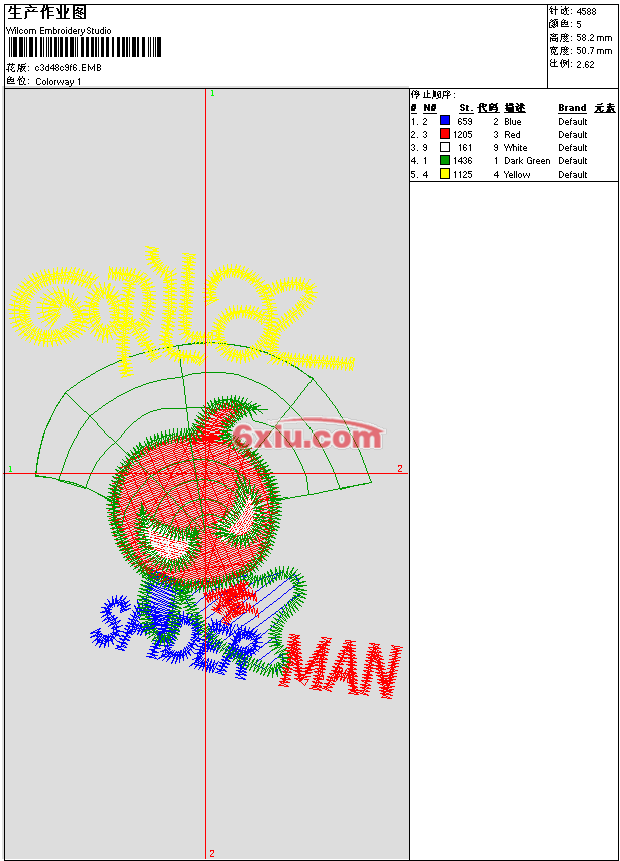 - emb花版参数: 大小:219.00 KB / 尺寸:51*58[毫米] / 针数:4588针 / 线色:5 / 格式:emb / 版本:e4.2