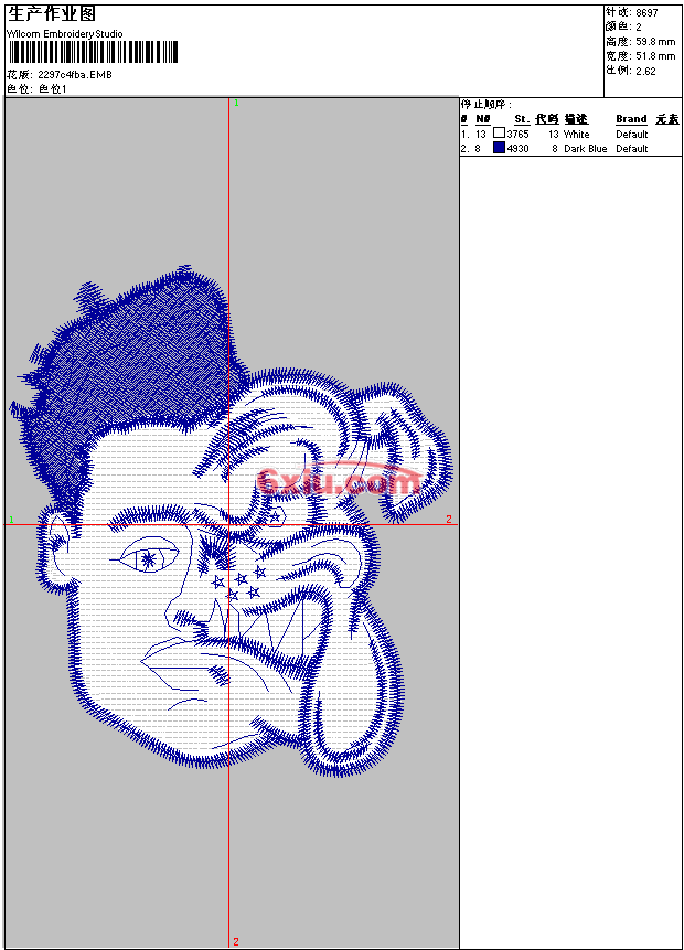 - emb花版参数: 大小:96.50 KB / 尺寸:52*60[毫米] / 针数:8697针 / 线色:2 / 格式:emb / 版本:e4.2