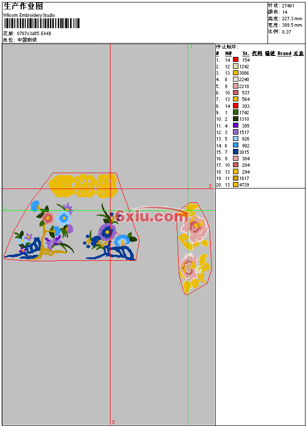 - emb花版参数: 大小:8.28 MB / 尺寸:390*227[毫米] / 针数:27481针 / 线色:14 / 格式:emb / 版本:e2