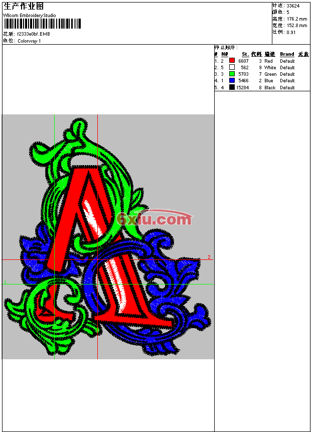 - emb花版参数: 大小:644.00 KB / 尺寸:153*176[毫米] / 针数:33624针 / 线色:5 / 格式:emb / 版本:e2