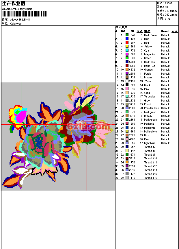 - emb花版参数: 大小:374.00 KB / 尺寸:340*319[毫米] / 针数:83588针 / 线色:38 / 格式:emb / 版本:9
