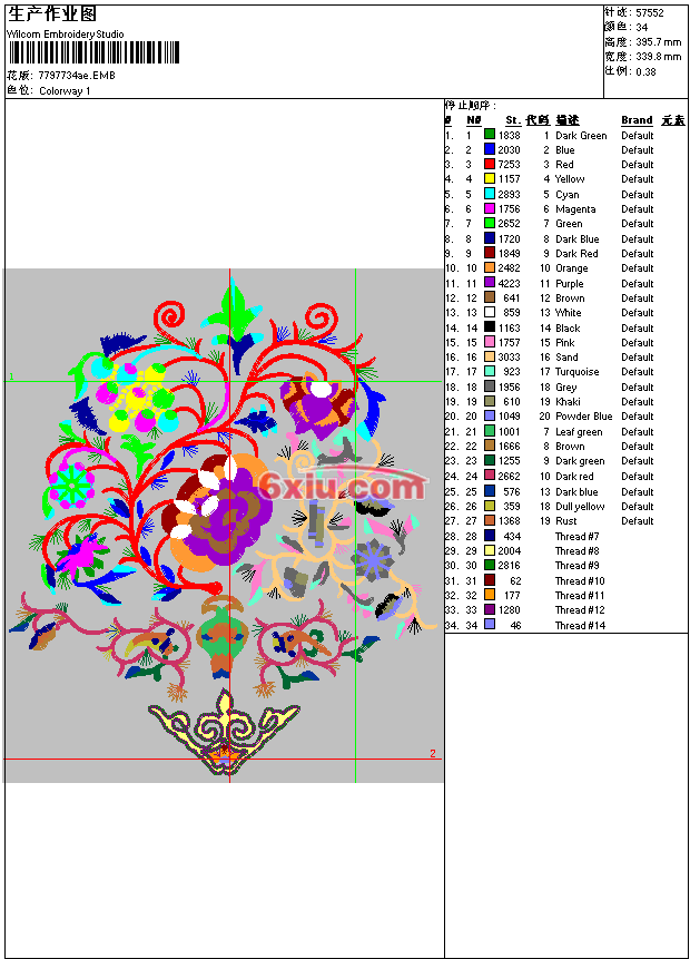 - emb花版参数: 大小:349.00 KB / 尺寸:340*396[毫米] / 针数:57552针 / 线色:34 / 格式:emb / 版本:9