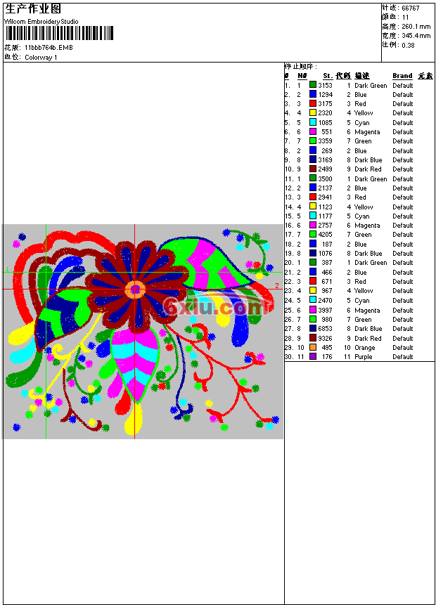 - emb花版参数: 大小:228.00 KB / 尺寸:345*260[毫米] / 针数:66767针 / 线色:11 / 格式:emb / 版本:9