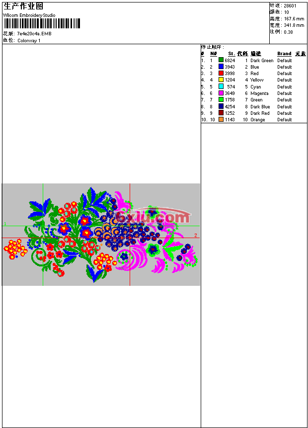 - emb花版参数: 大小:173.50 KB / 尺寸:342*168[毫米] / 针数:28601针 / 线色:10 / 格式:emb / 版本:9