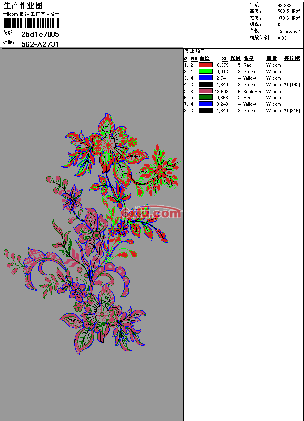 - emb花版参数: 大小:404.00 KB / 尺寸:371*509[毫米] / 针数:42963针 / 线色:6 / 格式:emb / 版本:e4.2