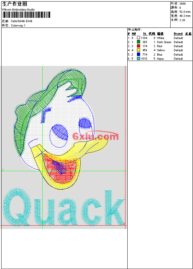 - emb花版参数: 大小:110.50 KB / 尺寸:40*52[毫米] / 针数:3888针 / 线色:6 / 格式:emb / 版本:e4.2