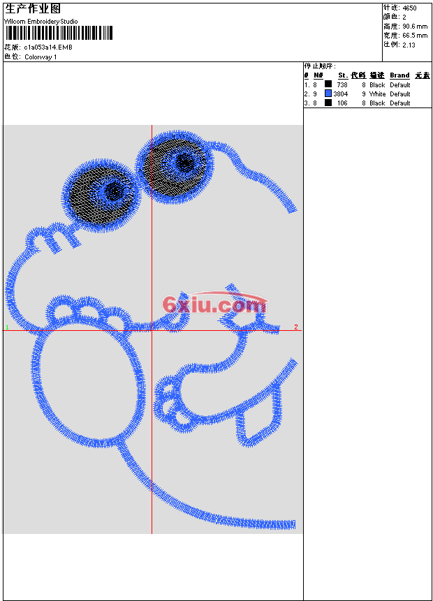 - emb花版参数: 大小:97.50 KB / 尺寸:66*91[毫米] / 针数:4651针 / 线色:3 / 格式:emb / 版本:e4.2