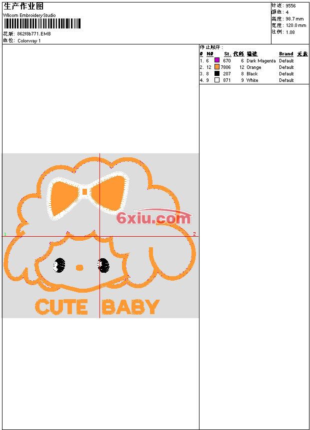 - emb花版参数: 大小:396.00 KB / 尺寸:120*99[毫米] / 针数:9546针 / 线色:4 / 格式:emb / 版本:e4.2