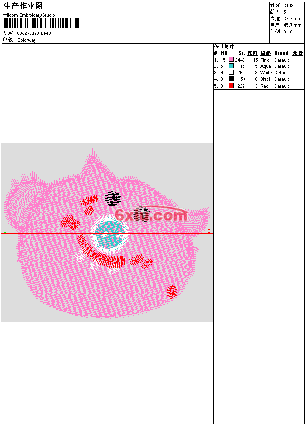 - emb花版参数: 大小:117.50 KB / 尺寸:46*38[毫米] / 针数:3119针 / 线色:5 / 格式:emb / 版本:e4.2