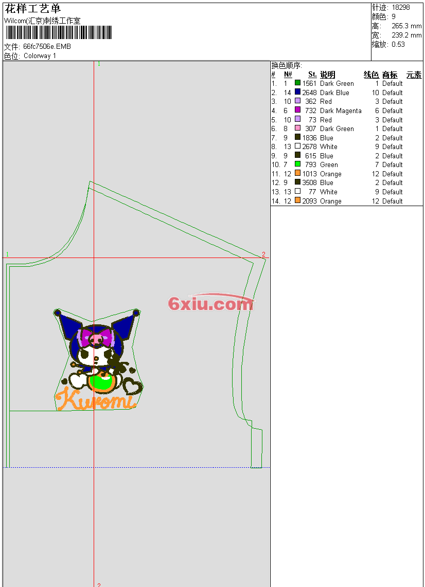 - emb花版参数: 大小:2.70 MB / 尺寸:239*265[毫米] / 针数:18307针 / 线色:9 / 格式:emb / 版本:e4.2