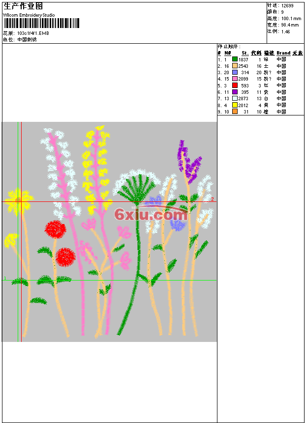 - emb花版参数: 大小:139.00 KB / 尺寸:98*100[毫米] / 针数:12699针 / 线色:9 / 格式:emb / 版本:e4.2
