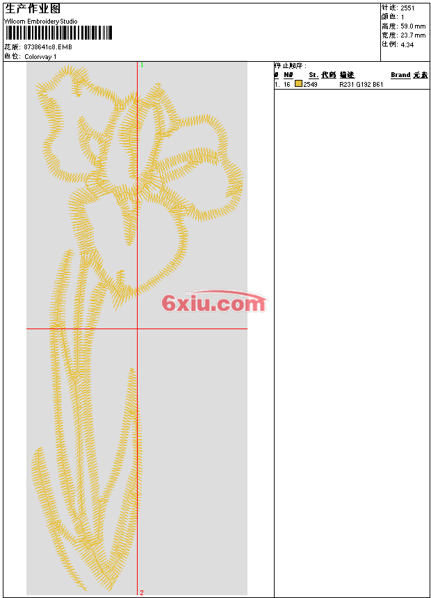 - emb花版参数: 大小:62.00 KB / 尺寸:24*59[毫米] / 针数:2551针 / 线色:1 / 格式:emb / 版本:e4.2