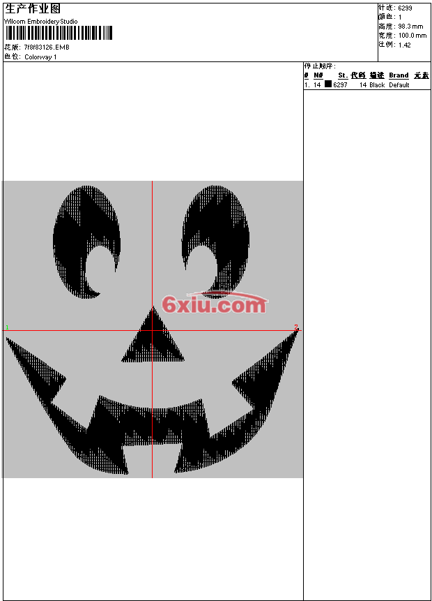 - emb花版参数: 大小:52.50 KB / 尺寸:100*98[毫米] / 针数:6299针 / 线色:1 / 格式:emb / 版本:e4.2