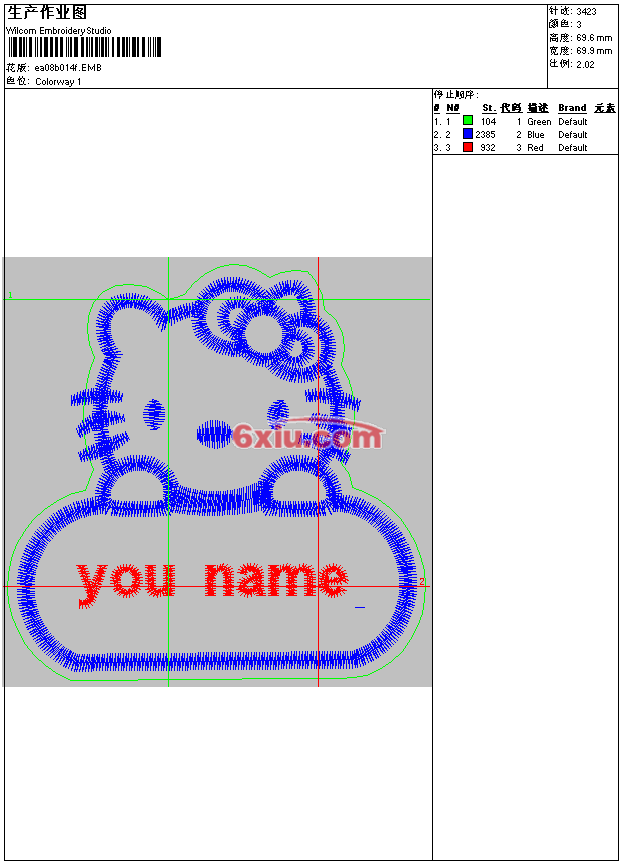KT猫 姓名贴 emb花版参数: 大小:79.50 KB / 尺寸:70*70[毫米] / 针数:3423针 / 线色:3 / 格式:emb / 版本:e4.2 版带文件需绣花软件方可打开,可配色打印导出各种格式或直接上机绣。如无绣花软件可下载1:1模拟效果图。 PNG图片信息:大小:0.1(MB) /图宽*高:265x264(像素) emb下载 1:1图下载 关闭 相关花版: 眼鼻子 熊头 蝴蝶结 兔子 南瓜 蝴蝶 国风熊猫 兔子 猫 熊 猴头 paul frank 大嘴猴 兔子 playboy 鞋面龙盘带绣 鞋面凤凰盘带绣 包包绣花 男 章 good luck 好运来 V领子 骨头 兔子 卡通 太阳 卡通 书 宇宙 辛普森 卡通 松鼠 扭曲女孩 小花 菠萝 可乐杯 吸管 穿裙女小熊 小飞象
