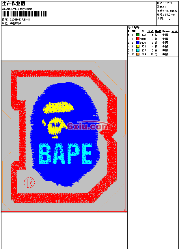 bape 标 emb花版参数: 大小:69.50 KB / 尺寸:85*103[毫米] / 针数:12521针 / 线色:6 / 格式:emb / 版本:e2 版带文件需绣花软件方可打开,可配色打印导出各种格式或直接上机绣。如无绣花软件可下载1:1模拟效果图。 PNG图片信息:大小:0.2(MB) /图宽*高:322x390(像素) emb下载 1:1图下载 关闭 相关花版: 牛头 la 男标 ny 标 logo 男 章 l球标 鹰标 LA 标 章标 鹰 猩猩 L 章标 03 毛巾绣 19 毛巾绣 珠片 虎头 LEVIS 熊头 狗头 TR 毛巾绣 鱼 鱼 鱼 小鹿圆标 头盔女孩 公仔 公仔 圆标 恐龙 universal 蜜蜂 LA 标 章 N+Y 标 NY 标